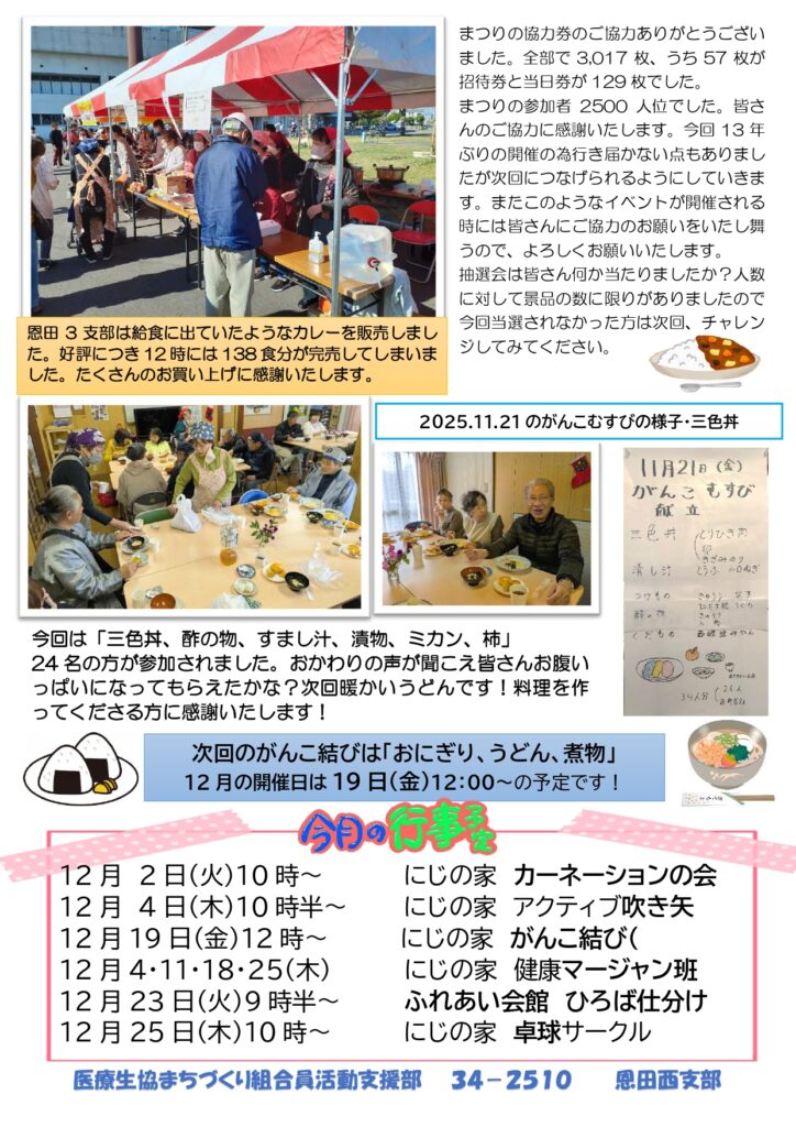恩田校区を三つに分けて、西側に位置する支部です。恩田町1・2丁目、笹山町、末広町、東芝中町の組合員さんが「ご近所福祉サロンにじ」を中心にして活動しています。