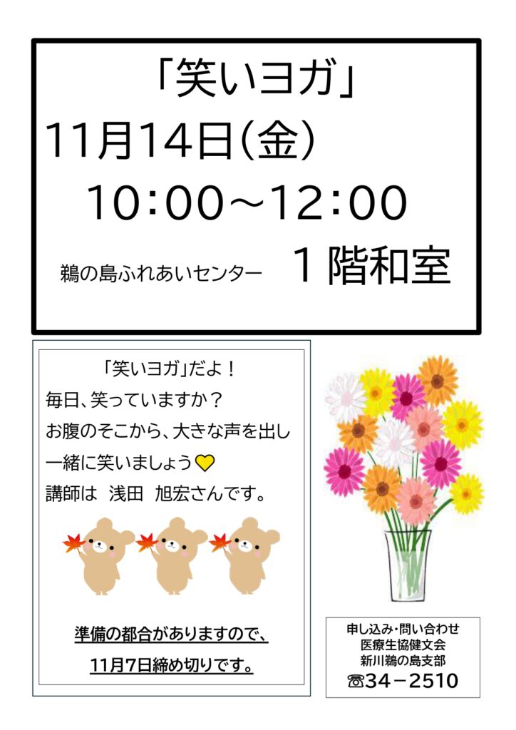 新川鵜の島支部 11月タオル体操・笑いヨガのお知らせ