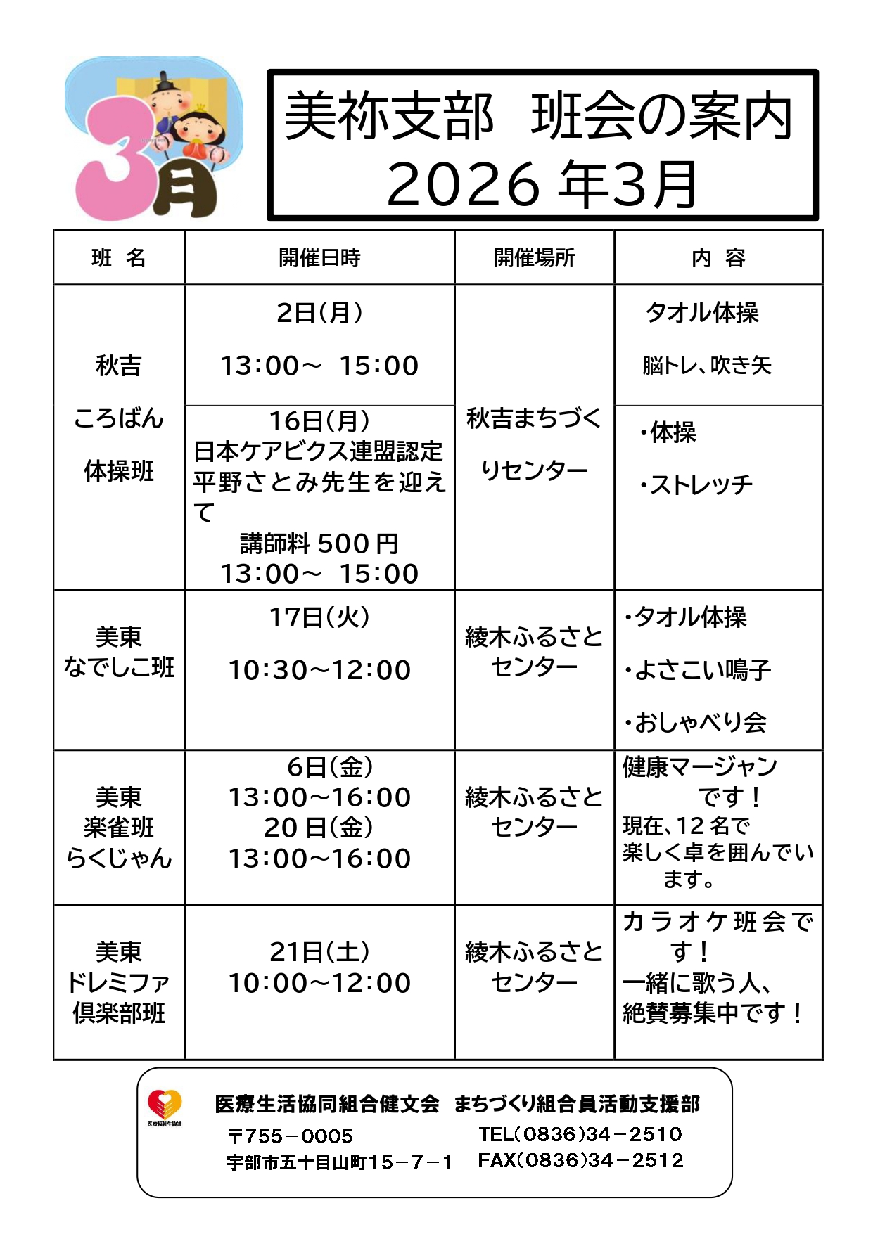 美祢支部 3月の班会予定のお知らせ